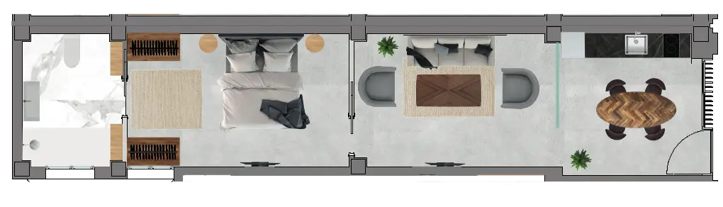 Los apartamentos se abren al exterior a través de grandes ventanales, proporcionando luminosidad y calidez.